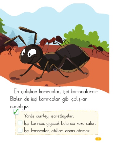 En çalışkan karıncalar, işçi karıncalardır. Bizler de işçi karıncalar gibi çalışkan olmalıyız. Yanlış cümleyi işaretleyelim. İşçi karınca, yiyecek bulunca koku salar. İşçi karıncalar, atıkları dışarı atamaz. 7