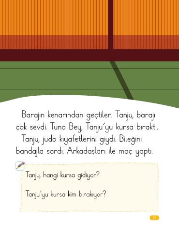 Barajın kenarından geçtiler. Tanju, barajı çok sevdi. Tuna Bey, Tanju’yu kursa bıraktı. Tanju, judo kıyafetlerini giydi. Bileğini bandajla sardı. Arkadaşları ile maç yaptı. Tanju, hangi kursa gidiyor? Tanju’yu kursa kim bırakıyor? 11