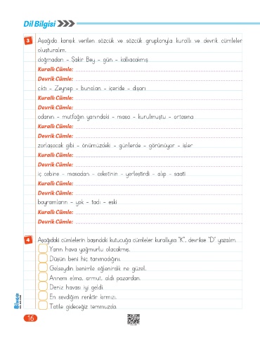 4 Aşağıdaki cümlelerin başındaki kutucuğa cümleler kurallıysa “K”, devrikse “D” yazalım.