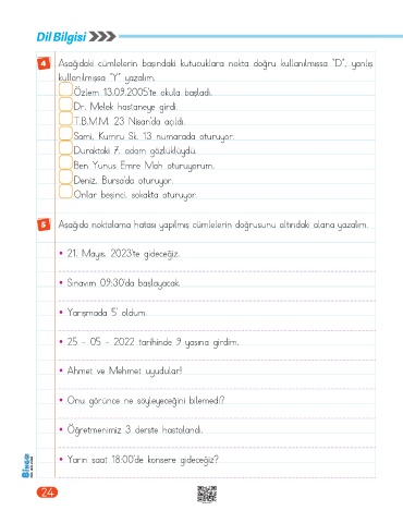 4 Aşağıdaki cümlelerin başındaki kutucuklara nokta doğru kullanılmışsa “D”, yanlış
