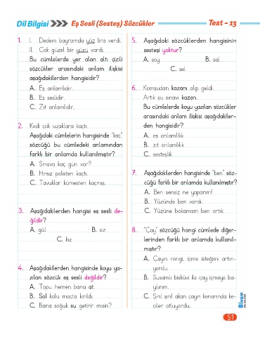 Dil Bilgisi               Eş Se   sli (Se  st e ş) Sö  z cük  le r                          T e st - 1  3