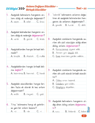1.  Aşağıdaki kelimelerin hangisinin an-              7.  "kalemlik” kelimesinin anlamını değiş-