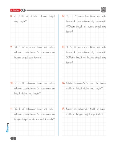 8. 6 yüzlük 4 birlikten oluşan doğal 12. “8, 0, 7” rakamları birer kez kul-