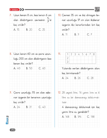 7. Uzun kenarı 8 cm, kısa kenarı 6 cm 10. Çevresi 35 cm ve ikiz olmayan ke-