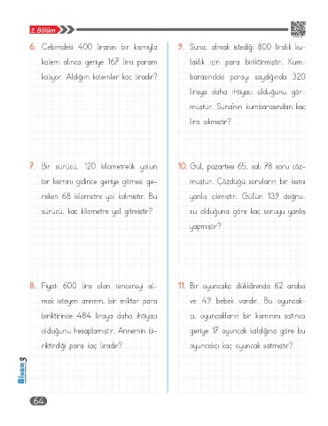 6. Cebimdeki 400 liranın bir kısmıyla 9. Suna, almak istediği 800 liralık ku-