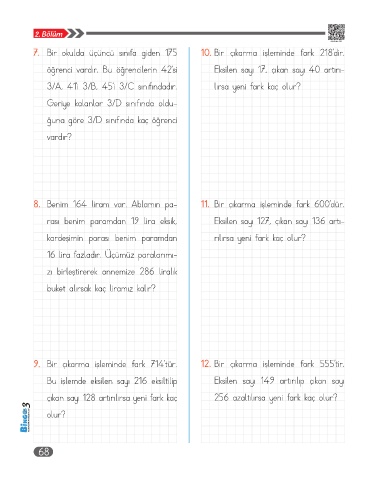 7. Bir okulda üçüncü sınıfa giden 175 10. Bir çıkarma işleminde fark 218’dir.