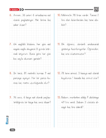 9. 96 ceviz, 6 kişiye eşit olarak paylaş- 13. Babam, marketten aldığı 7 çikolataya