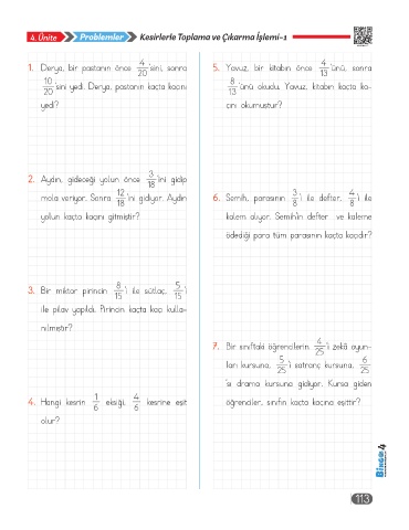 4. Ünite Problemler Kesirlerle Toplama ve Çıkarma İşlemi-1