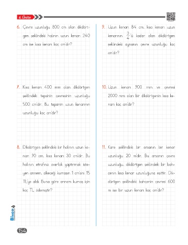 6. Çevre uzunluğu 800 cm olan dikdört- 9. Uzun kenarı 84 cm, kısa kenarı uzun