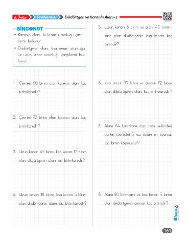 4. Uzun kenarı 18 birim, kısa kenarı 5 birim 8. Alanı 80 birimkare ve kısa kenarı 5 birim