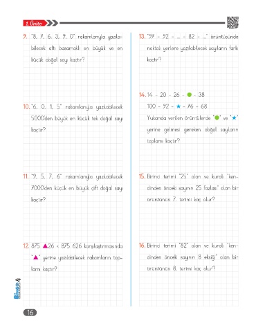 9. “8, 7, 6, 3, 9, 0” rakamlarıyla yazıla- 13. “97 - 92 - ... - 82 - ...” örüntüsünde