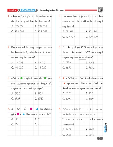 2. Beş basamaklı bir doğal sayının on bin- 6. En yakın yüzlüğü 4900 olan doğal sayı
