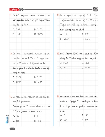 9. “6327” sayısının binler ve onlar ba- 12. Bir kamyon boşken ağırlığı 2850 kg’dır.