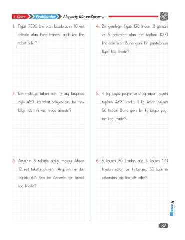 1. Fiyatı 9500 lira olan buzdolabını 10 eşit 4. Bir gömleğin fiyatı 150 liradır. 3 gömlek