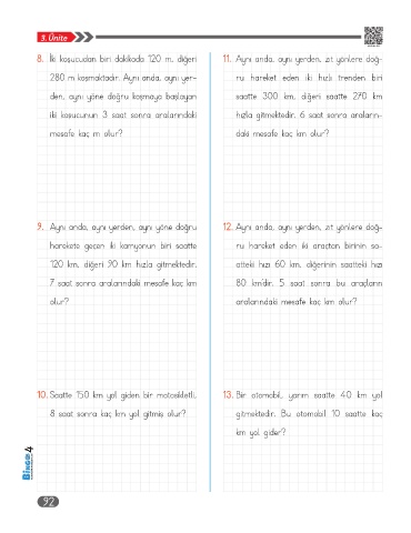 10. Saatte 150 km yol giden bir motosikletli, 13. Bir otomobil, yarım saatte 40 km yol
