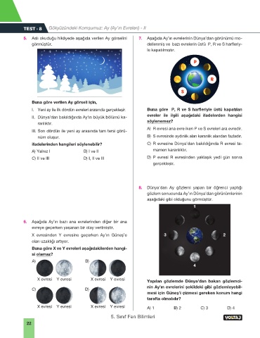 5. Aslı okuduğu hikâyede aşağıda verilen Ay görselini 7. Aşağıda Ay’ın evrelerinin Dünya’dan görünümü mo-