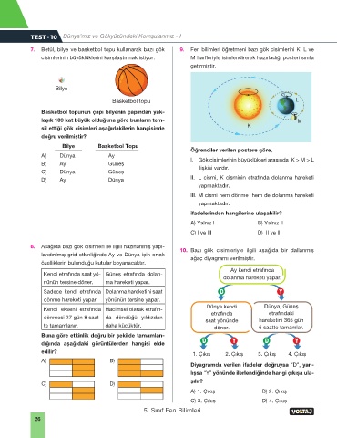 7. Betül, bilye ve basketbol topu kullanarak bazı gök 9. Fen bilimleri öğretmeni bazı gök cisimlerini K, L ve