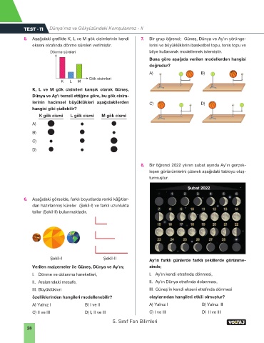 5. Aşağıdaki grafikte K, L ve M gök cisimlerinin kendi 7. Bir grup öğrenci; Güneş, Dünya ve Ay’ın yörünge-