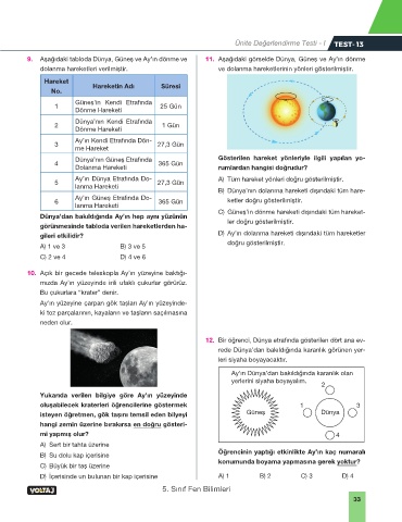 9. Aşağıdaki tabloda Dünya, Güneş ve Ay’ın dönme ve 11. Aşağıdaki görselde Dünya, Güneş ve Ay’ın dönme