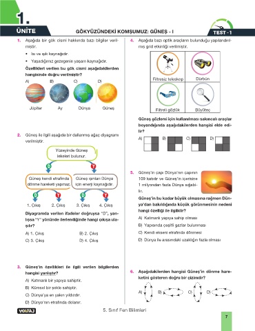 ÜNİTE GÖKYÜZÜNDEKİ KOMŞUMUZ: GÜNEŞ - I TEST - 1