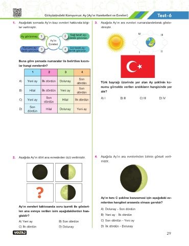 2. Aşağıda Ay’ın dört ana evresinden üçü verilmiştir. 4. Aşağıda Ay’ın ara evrelerinden birinin görseli veril-