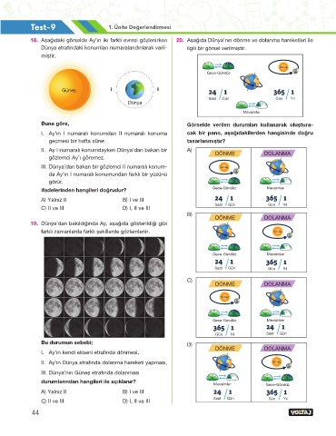 18. Aşağıdaki görselde Ay’ın iki farklı evresi gözlenirken 20. Aşağıda Dünya’nın dönme ve dolanma hareketleri ile