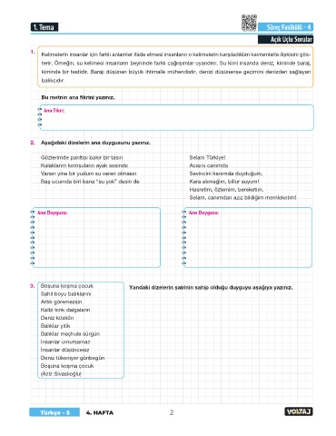 2. Aşağıdaki dizelerin ana duygusunu yazınız.