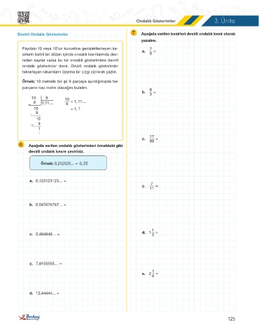 Devirli Ondalık Gösterimler 7 Aşağıda verilen kesirleri devirli ondalık kesir olarak