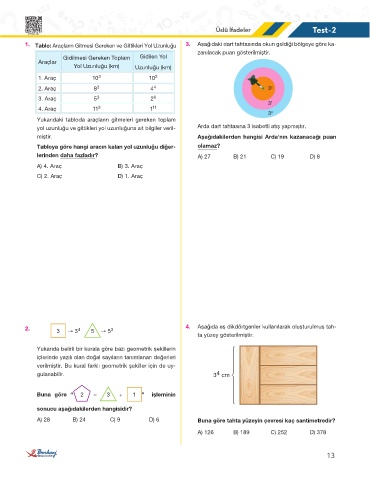 1. Tablo: Araçların Gitmesi Gereken ve Gittikleri Yol Uzunluğu 3. Aşağıdaki dart tahtasında okun geldiği bölgeye göre ka-