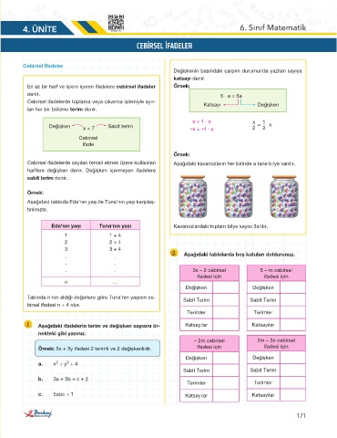 Cebirsel ifadelerde toplama veya çıkarma işlemiyle ayrı- Katsayı Değişken