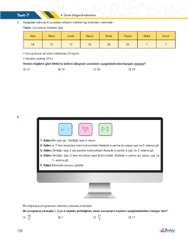 7. Aşağıdaki tabloda 8 çocuktan altısının kütleleri kg cinsinden verilmiştir.