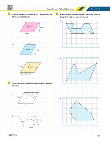 5 Alanları verilen paralelkenarların verilmeyen her 7 Kareli zemine çizilen aşağıdaki şekillerde mavi ile