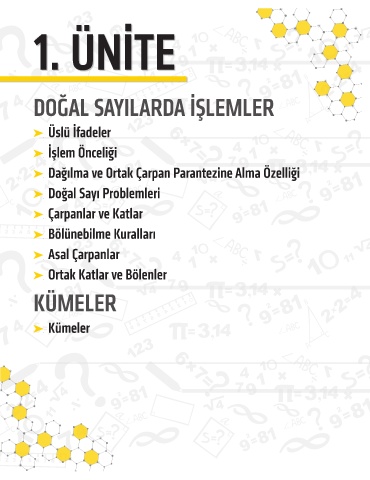 1. ÜNİTE DOĞAL SAYILARDA İŞLEMLER Üslü İfadeler İşlem Önceliği Dağılma ve Ortak Çarpan Parantezine Alma Özelliği Doğal Sayı Problemleri Çarpanlar ve Katlar Bölünebilme Kuralları Asal Çarpanlar Ortak Katlar ve Bölenler KÜMELER Kümeler