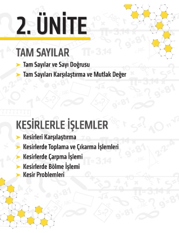2. ÜNİTE TAM SAYILAR Tam Sayılar ve Sayı Doğrusu Tam Sayıları Karşılaştırma ve Mutlak Değer KESİRLERLE İŞLEMLER Kesirleri Karşılaştırma Kesirlerde Toplama ve Çıkarma İşlemleri Kesirlerde Çarpma İşlemi Kesirlerde Bölme İşlemi Kesir Problemleri