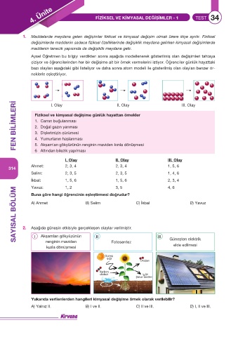 4. Ünite FİZİKSEL VE KİMYASAL DEĞİŞİMLER - 1 TEST 34