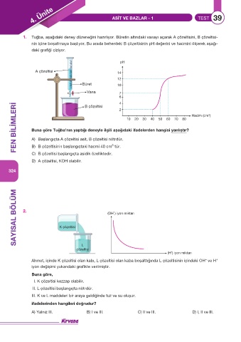 1. Tuğba, aşağıdaki deney düzeneğini hazırlıyor. Büretin altındaki vanayı açarak A çözeltisini, B çözeltisi-