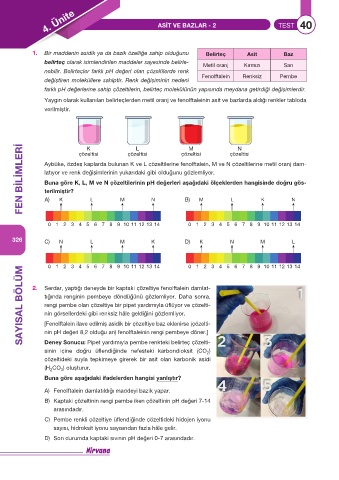 FEN BİLİMLERİ Aybüke, özdeş kaplarda bulunan K ve L çözeltilerine fenolftalein, M ve N çözeltilerine metil oranj dam- FEN BİLİMLERİ