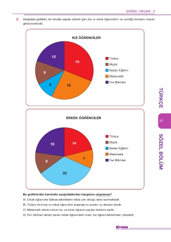 2. Aşağıdaki grafikler, bir okulda yapılan ankete göre kız ve erkek öğrencilerin en sevdiği derslerin oranını